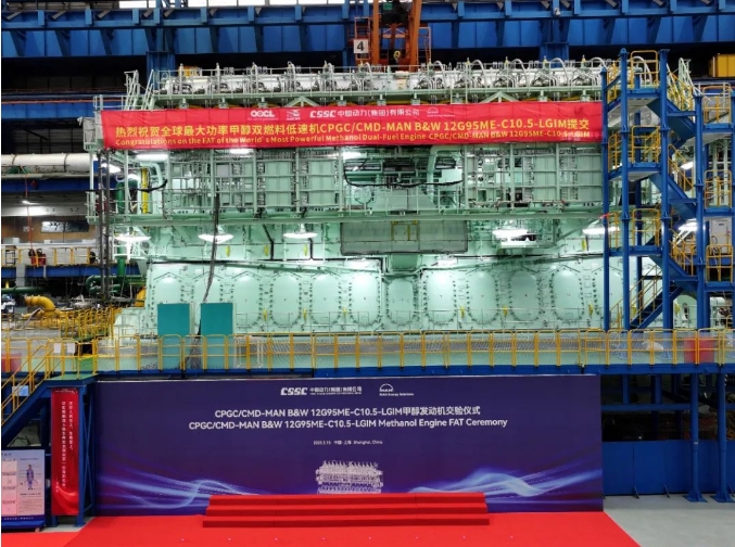5月15日,中船集團旗下中船動力與MAN ES聯合舉辦的CPGC/CMD-MAN B&W 12G95ME-C10.5-LGIM-EGRTC甲醇發動機工廠驗收測試(FAT)交驗儀式在中船動力下屬中船三井成功舉行。