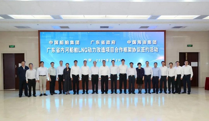 ????5月29日,中國船舶集團有限公司與廣東省人民政府、中國海洋石油有限公司在京簽署《廣東省內河船舶LNG動力改造項目合作框架協議》。廣東省委副書記、省長馬興瑞,中國船舶集團黨組書記、董事長雷凡培,中國海油黨組書記、董事長汪東進,中國船舶集團黨組成員、副總經理杜剛,中國海油黨組成員、副總經理陳壁出席簽約儀式。廣東省副省長覃偉中,中國船舶集團黨組成員、副總經理孫偉,中國海油黨組成員、總會計師溫冬芬分別代表各方在協議上簽字。