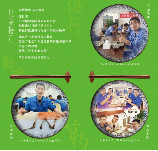 ????中國船舶集團堅決貫徹落實習近平總書記關于制止餐飲浪費行為的重要指示精神,從制度出發、從細節入手、從點滴做起,通過組織開展“制止餐飲浪費踐行光盤行動”專項宣傳引導活動、制作“光盤行動”宣傳手冊等一系列有力措施,全面倡導勤儉節約、反對浪費的文明理念,大力營造浪費可恥、節約為榮的氛圍,取得了良好效果。