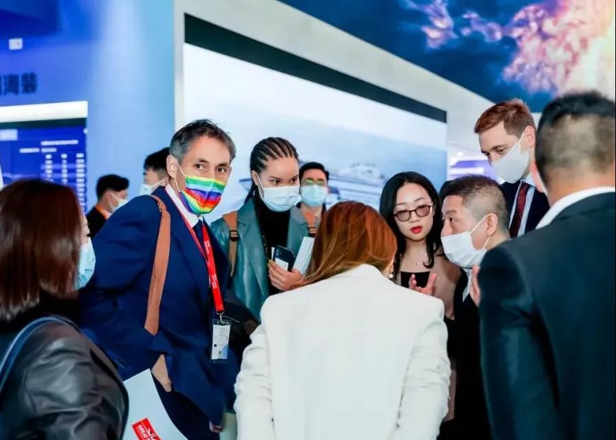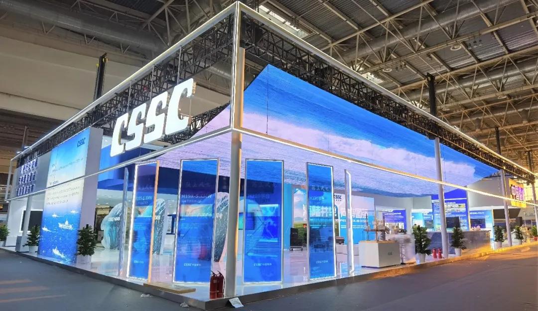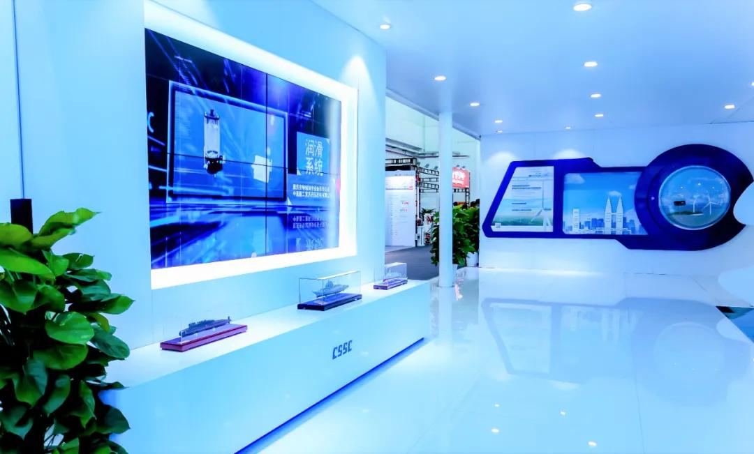 中國船舶集團展臺摒棄了“傳統(tǒng)色彩矩陣”,用“深海藍”加 “風(fēng)機白”打造出大氣磅礴的開合式復(fù)合空間域,細節(jié)上則采用生態(tài)為先、大道至簡、科技為尚三大設(shè)計語言,將“風(fēng)傳送”“海推動”“碳排放”業(yè)務(wù)生態(tài)鏈條進行了全方位的解構(gòu),吸引了眾多觀展人士駐足。