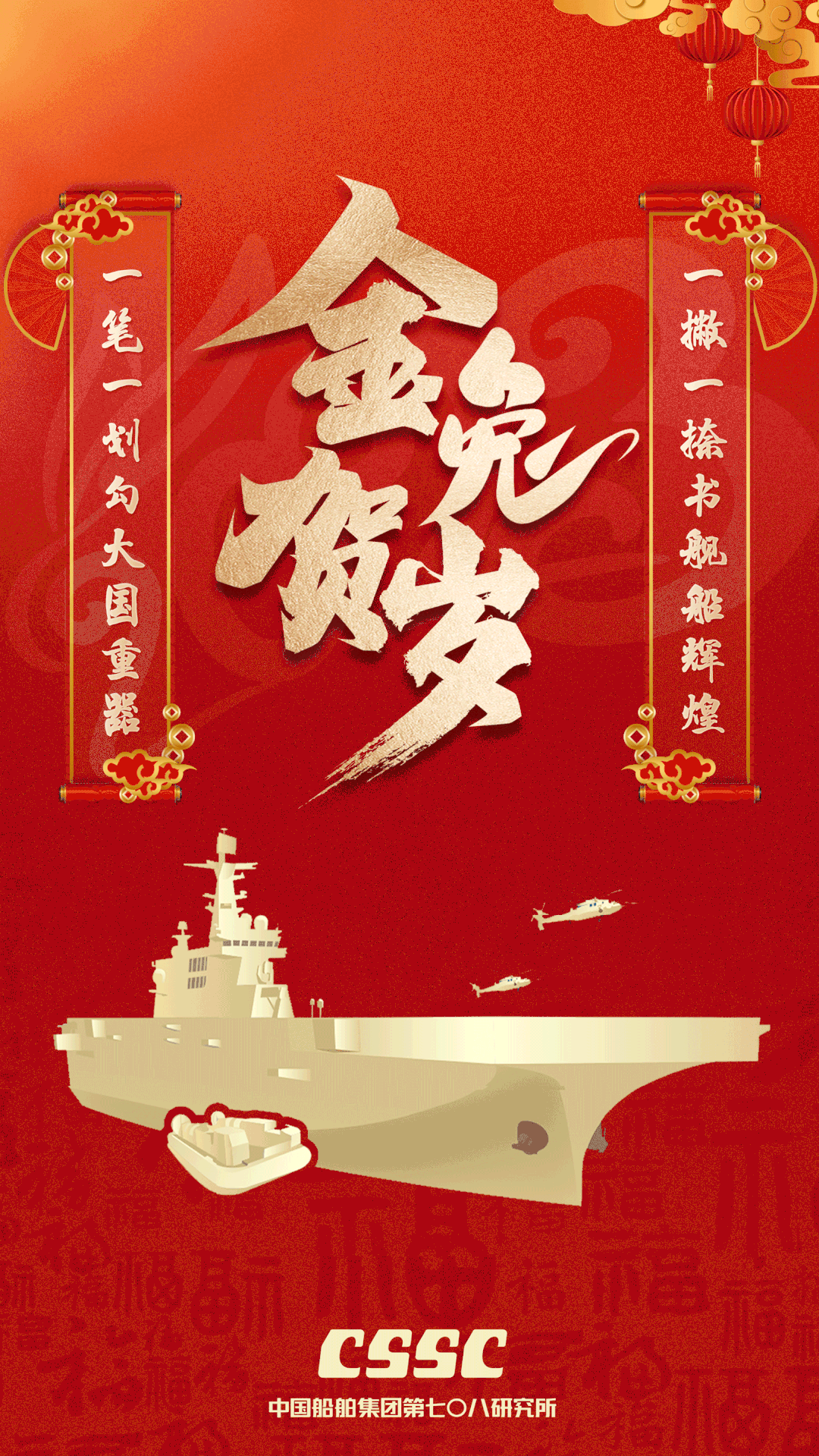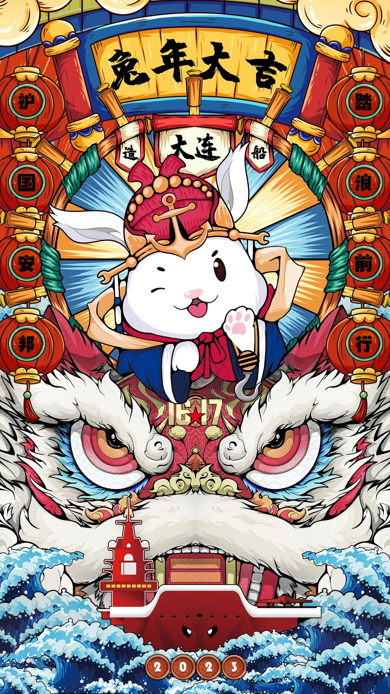 海報中所展現(xiàn)的元素,皆由大連造船元素組成,中間癸卯兔的頭冠裝飾以船錨、舵軸為主,下方航母在海中追風逐浪,象征大連造船必將在新時代發(fā)展中踏浪前行。