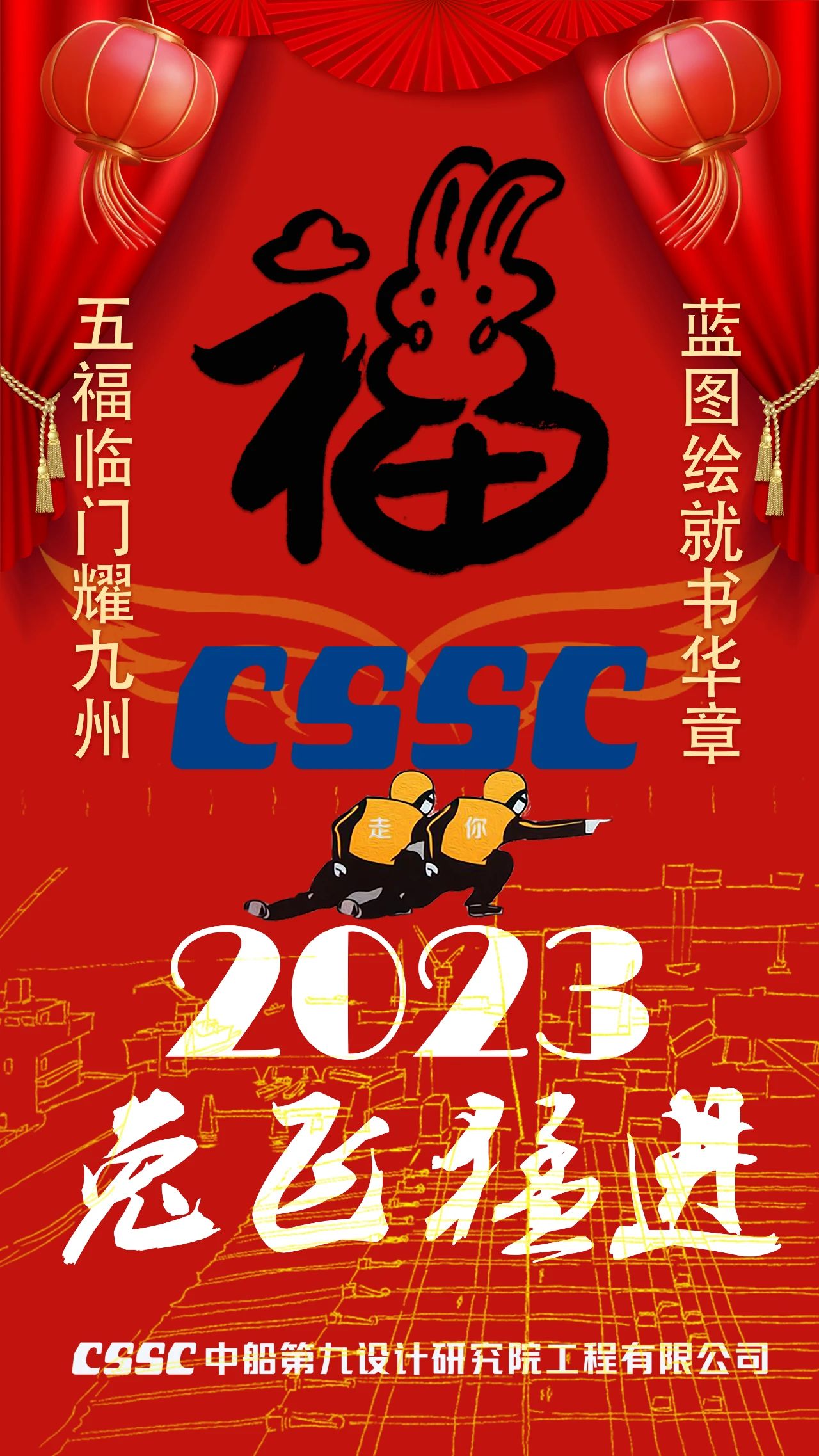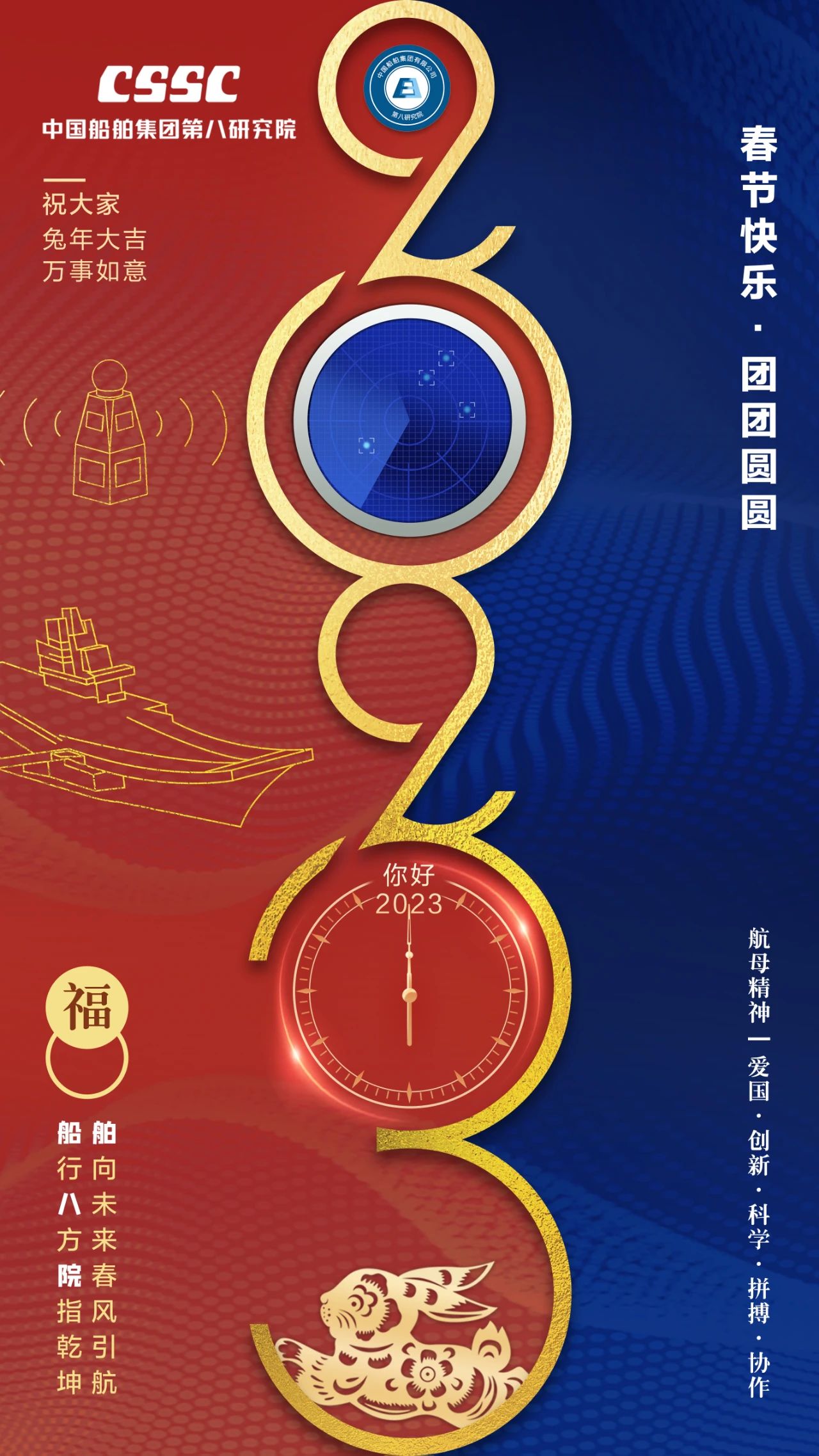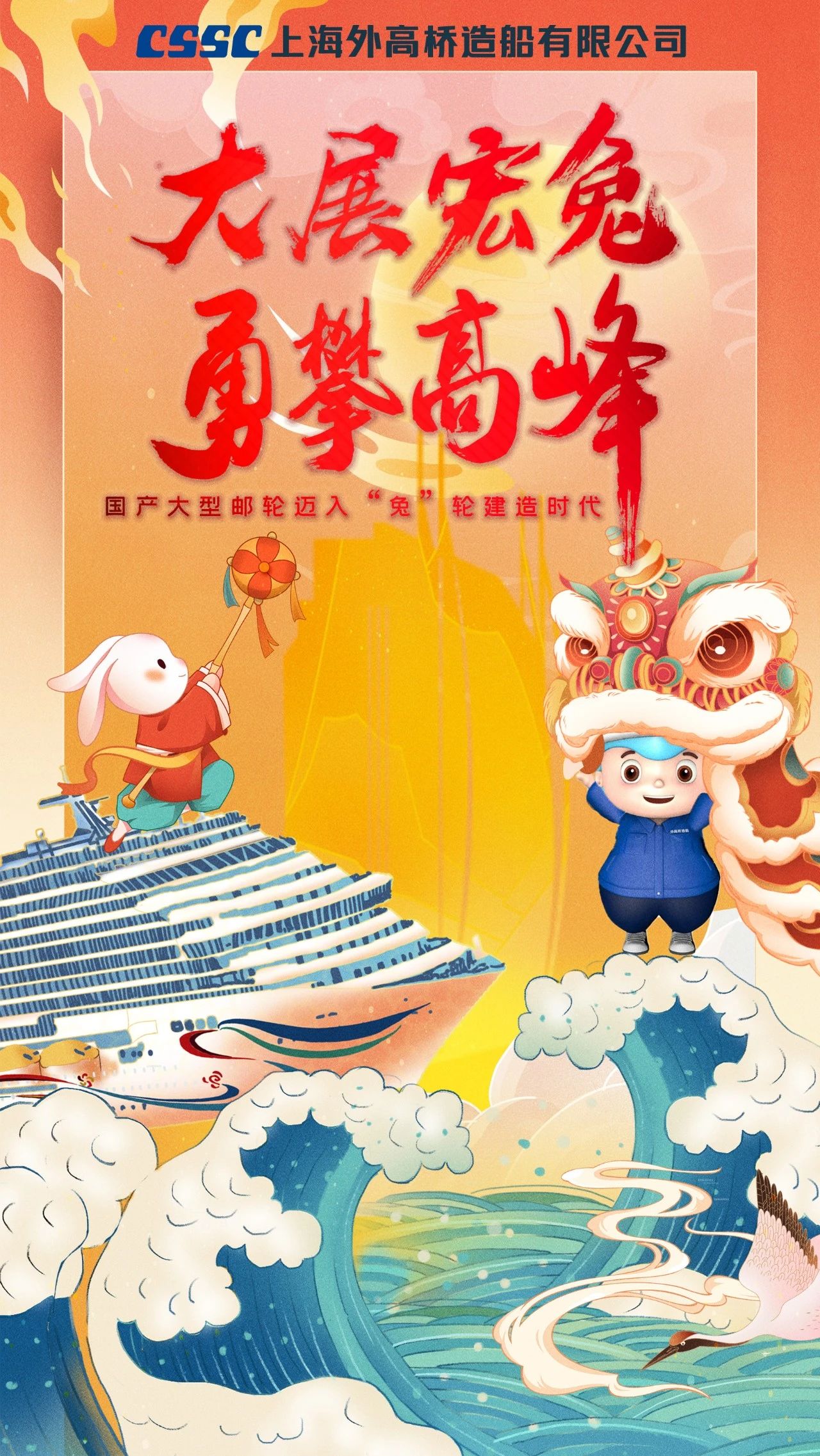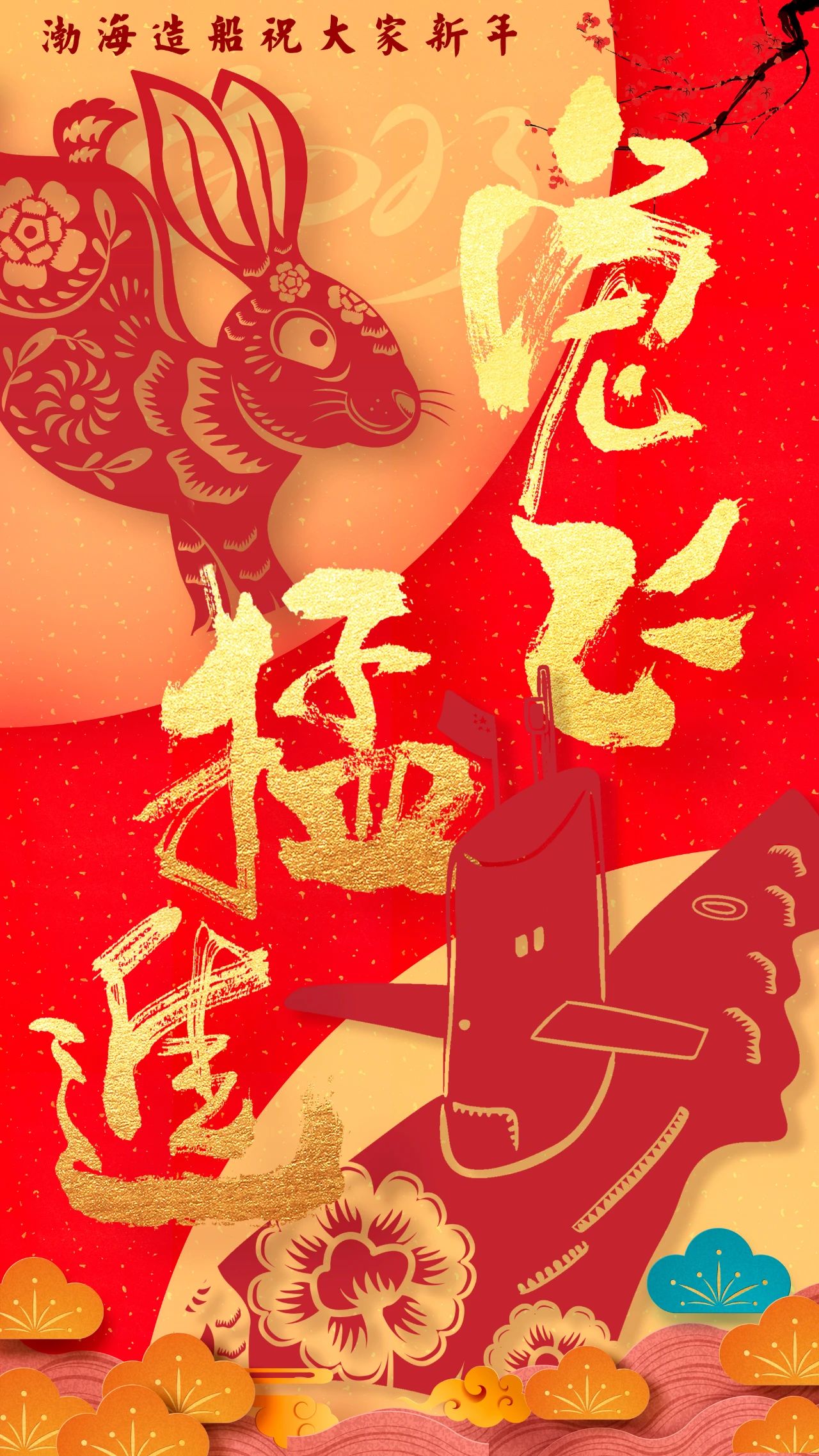 渤海造船的拜年海報以紅色背景為基礎(chǔ),奠定喜慶祥和的節(jié)日氛圍,畫面主體采用中國傳統(tǒng)民間剪紙藝術(shù),將飛騰的瑞兔與破浪的國之重器有機結(jié)合,讓我們2023年突飛猛進,大展宏圖!