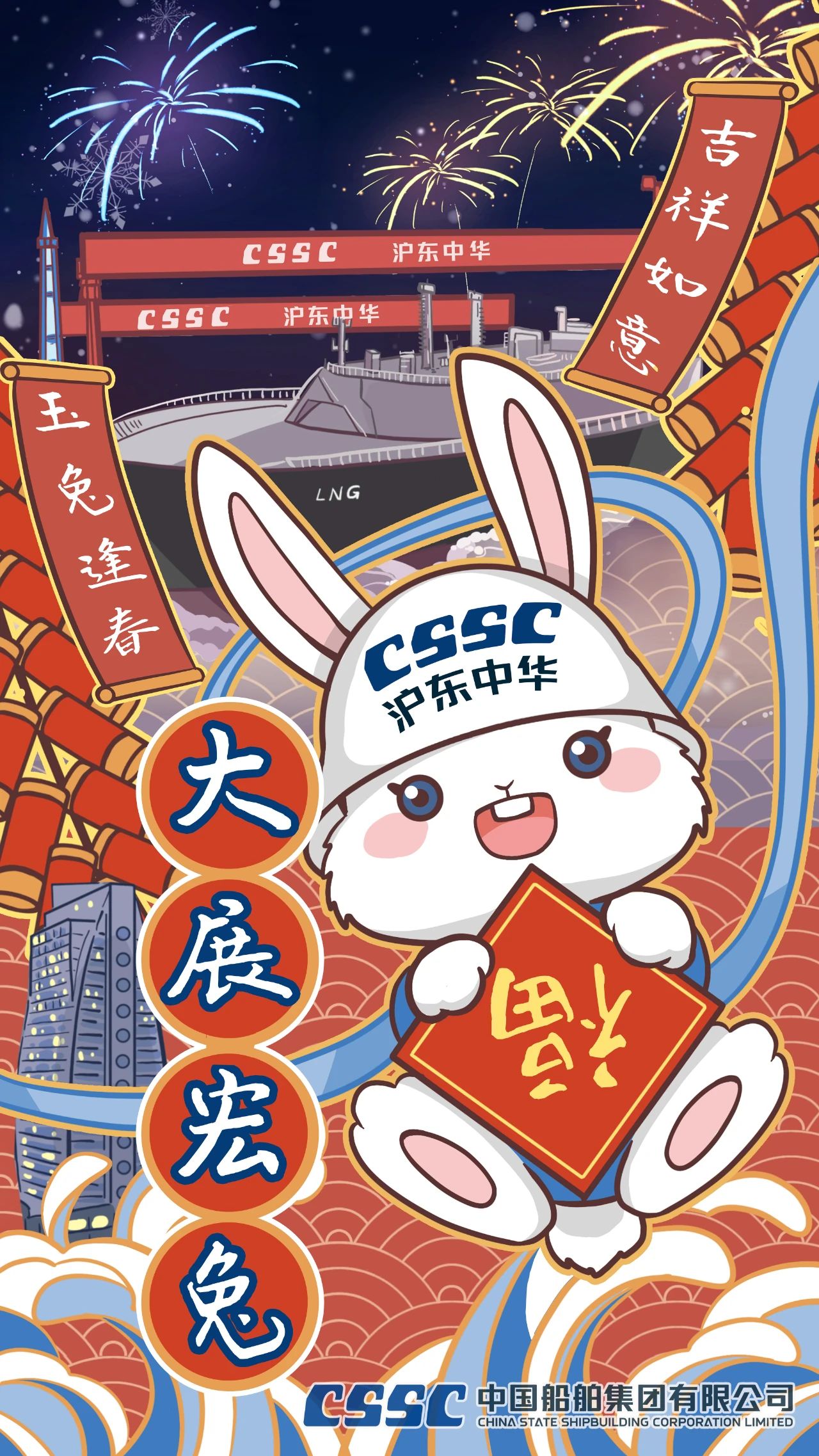它采用插畫表現(xiàn)形式,勾勒出在煙花綻放的夜空下,滬東中華的龍門吊和LNG船等。玉兔逢春開新局,2023,我們將繼續(xù)拼搏,展宏“兔”!