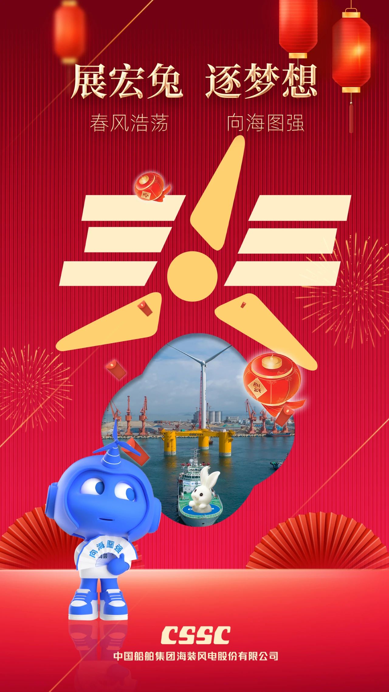 海報主體部分以國內(nèi)首臺深遠海浮式風電裝備“扶搖號”為創(chuàng)意點,通過含有“大風車”形象的寫意“春”字,表達中船海裝將在春風浩蕩中大展宏“兔”,在向海圖強征程中矢志奮斗!
