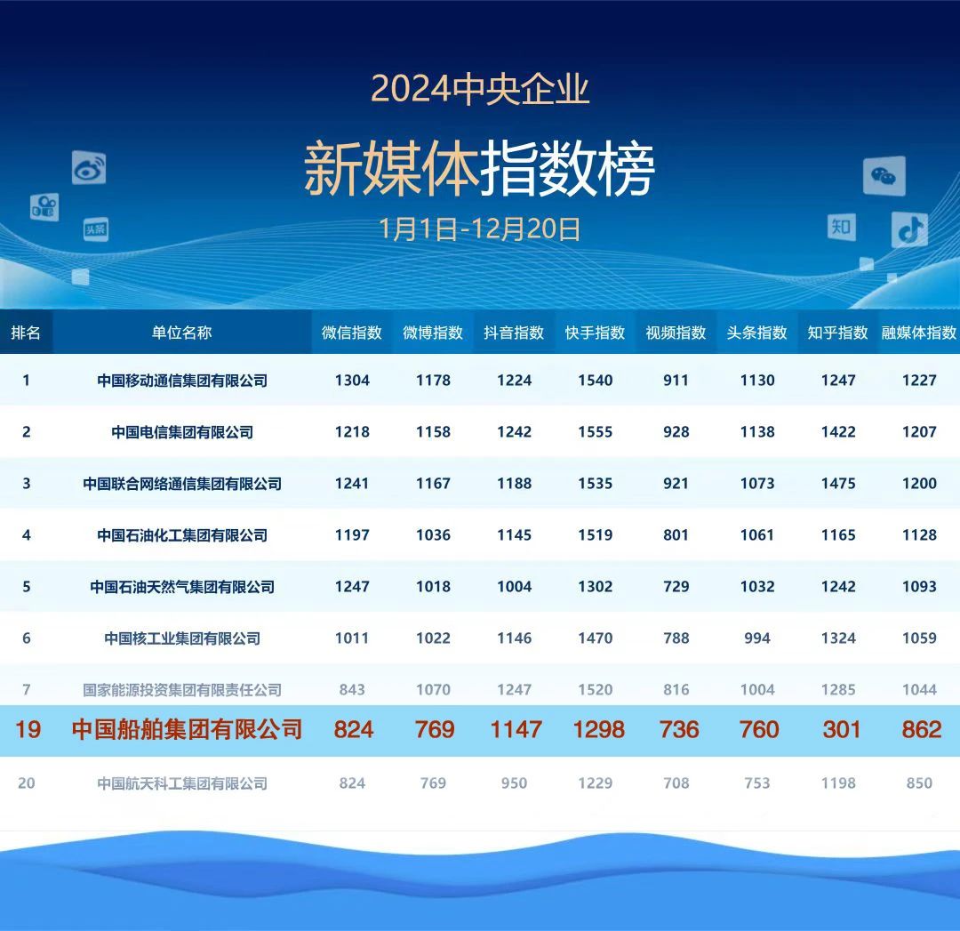 2024年——中船集團新媒體平臺綜合指數進入2024年度中央企業新媒體指數榜前20!