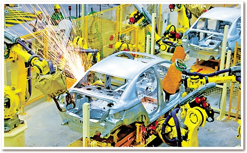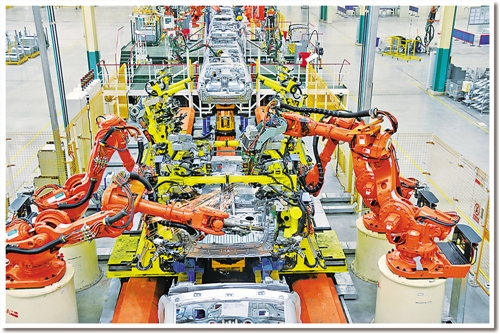 日前,記者在東風汽車公司旗下神龍汽車公司成都工廠焊裝車間看到,占地面積約10個足球場的車間儼然就是一個“機器人王國”:442臺各種機器人都在忙碌著,所有點焊、弧焊、激光焊、螺柱焊、涂膠、包邊、鉚接、部件搬運等“重活、累活”全部由機器人自動完成。焊裝分廠廠長孫繼勝介紹說,除442臺機器人外,車間還有另外一個“撒手锏”??六面體轉臺設備。“原來生產1個車型要建6條生產線,現在1條生產線就可以生產6種車型?!睂O繼勝說。