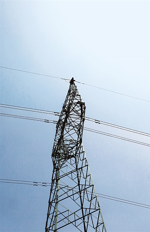 一名電工爬上一座電網塔基進行檢修。這條331公里的輸電線路是新疆東南部且末縣和若羌縣10萬多居民用電的主要憑借。