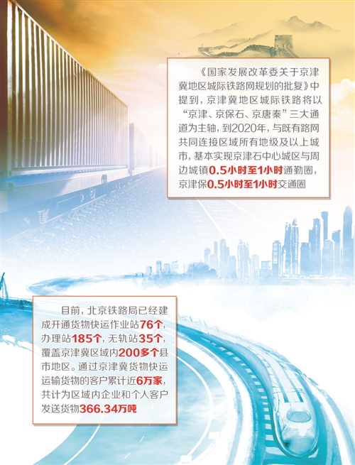 5年來,這樣的好消息在京津冀區域頻傳。一幅以首都北京為中心,以天津、河北(石家莊)為鼎足的區域軌道快速交通網絡正越織越密,描繪出軌道上的京津冀運輸宏偉新藍圖。目前已有超過12億人次、6萬余家企業、京津冀區域內200多個縣(市、區)的百姓,享受到鐵路改革發展帶來的便利。