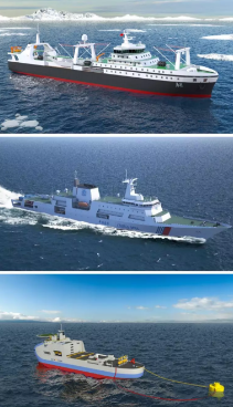 圖1:南極磷蝦捕撈加工船效果圖;圖2:首艘萬噸級海事巡邏船效果圖;圖3:首個民用涉核總體設(shè)計項目效果圖。
