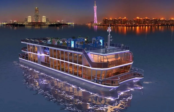 ????280客位珠江夜游船總長38.8米,型寬12.0米,型深3.2米,航速10.0節,是粵港澳大灣區首艘入級商業運營新能源客船,外觀設計新穎獨特,純電池動力突顯低噪音、低排放、綠色環保的優勢,對于推動粵港澳大灣區旅游和交通產業的綠色發展具有重要意義。