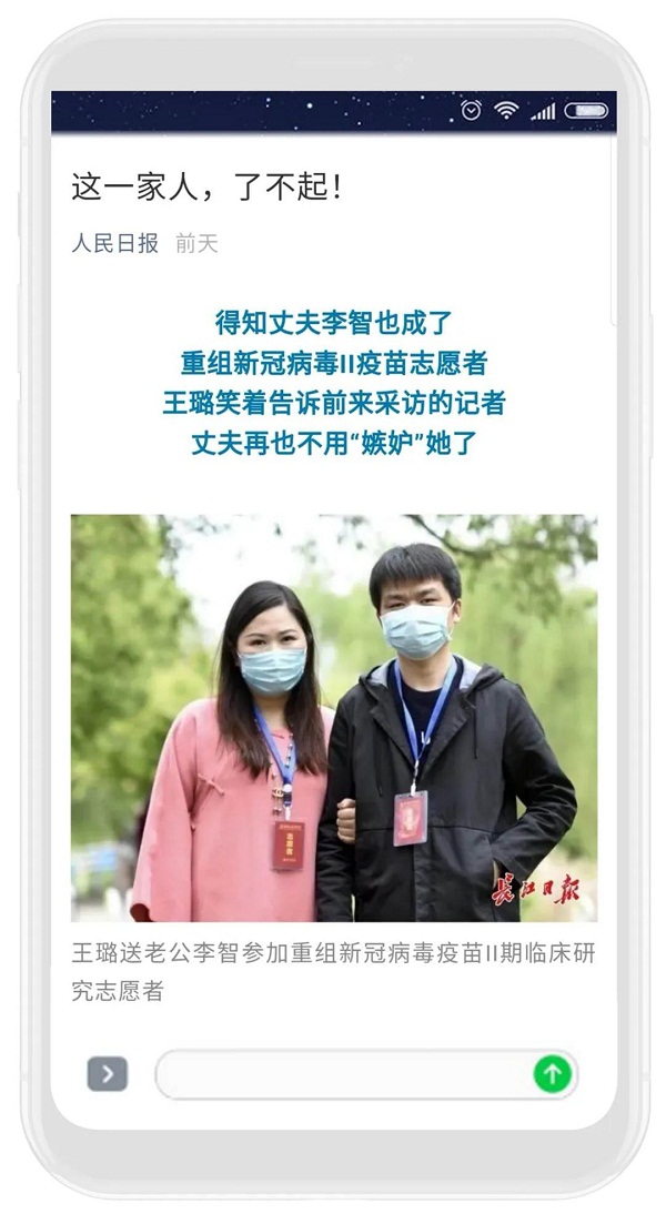 ????4月18日,人民日報微信公眾號推送了這樣一條消息,詳細介紹了一位土生土長的武漢人王璐及其家人自愿報名接種新冠疫苗的事跡,消息收獲了10萬+的閱讀量與3.2萬的“在看” ,還有動輒幾千的留言點贊!這位女主角王璐來自中國船舶集團七一七所,不同于第一批結束醫學觀察的志愿者,王璐所在組的年齡在20歲到50歲,是最早一批高劑量的接種者。