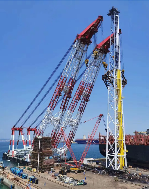 7月7日,世界最大FPSO火炬塔即MV31 FPSO火炬塔在中國船舶集團旗下大船集團成功吊裝。MV31 FPSO火炬塔自身總重595噸,總高度140米。由于受到海吊尺寸及吊重能力的限制,經(jīng)過反復(fù)論證,項目組決定將火炬塔分成兩個半段吊裝,其中上段高度達120米,需要整體翻身吊裝。