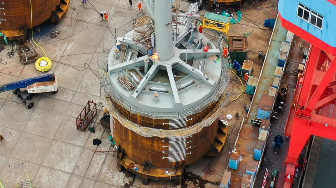 7月31日,廣船國際建造的我國第一臺吸力筒導管架風機基礎,在廣州南沙成功發運。吸力筒導管架是海上風電場的基礎設備,這次交付的吸力筒導管架總高63米,足有20層樓的高度,總重量約為1560噸,相當于15輛重型卡車滿載的重量,由3個直徑約為13米、高約11米的吸力筒和高52米的上部導管架組成。