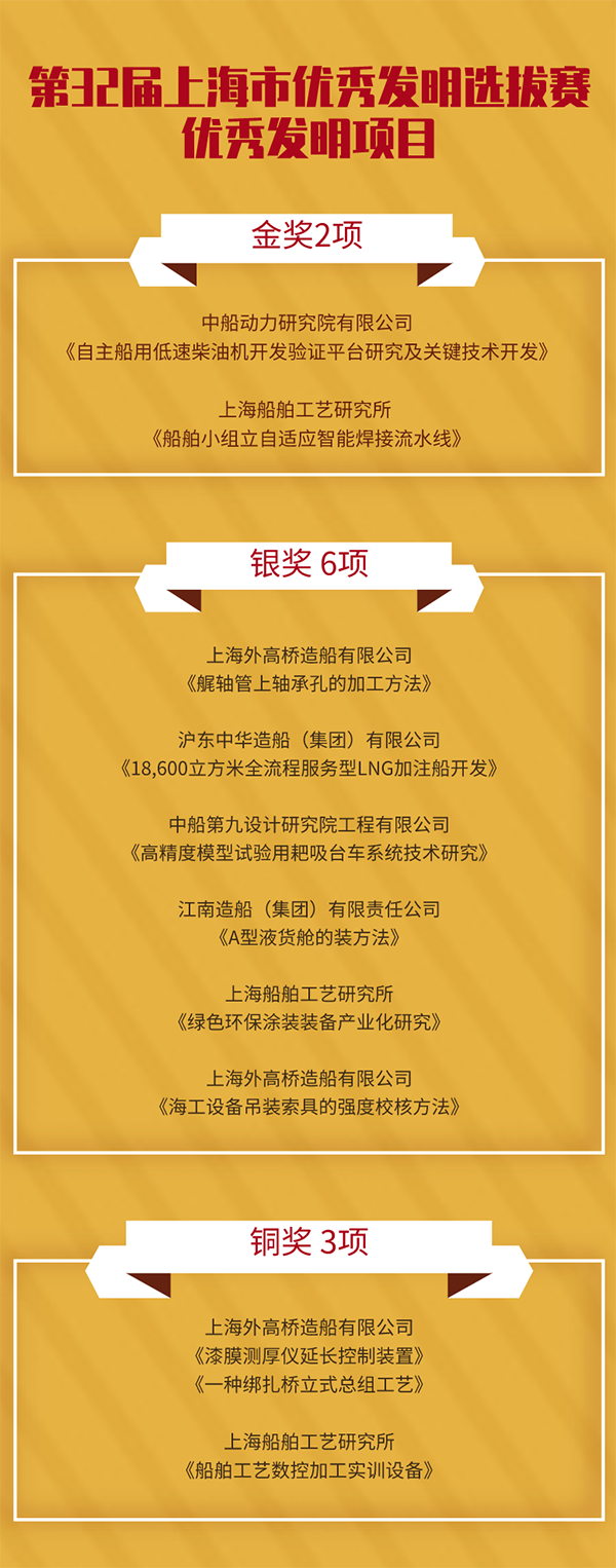 中國船舶集團上海船舶系統共19項職工創新成果,在第32屆上海市優秀發明選拔賽等各項賽事中斬獲佳績。