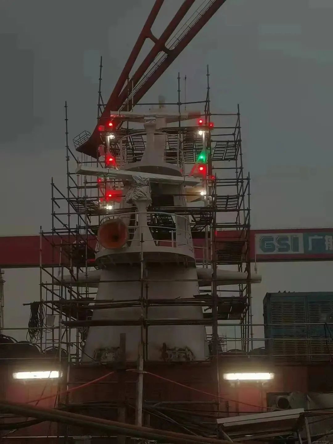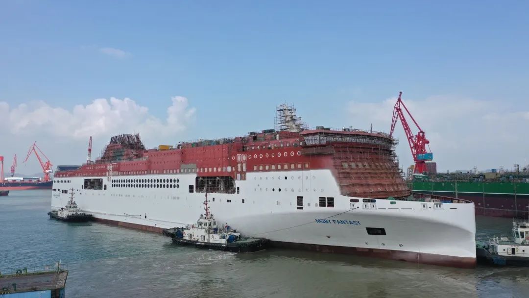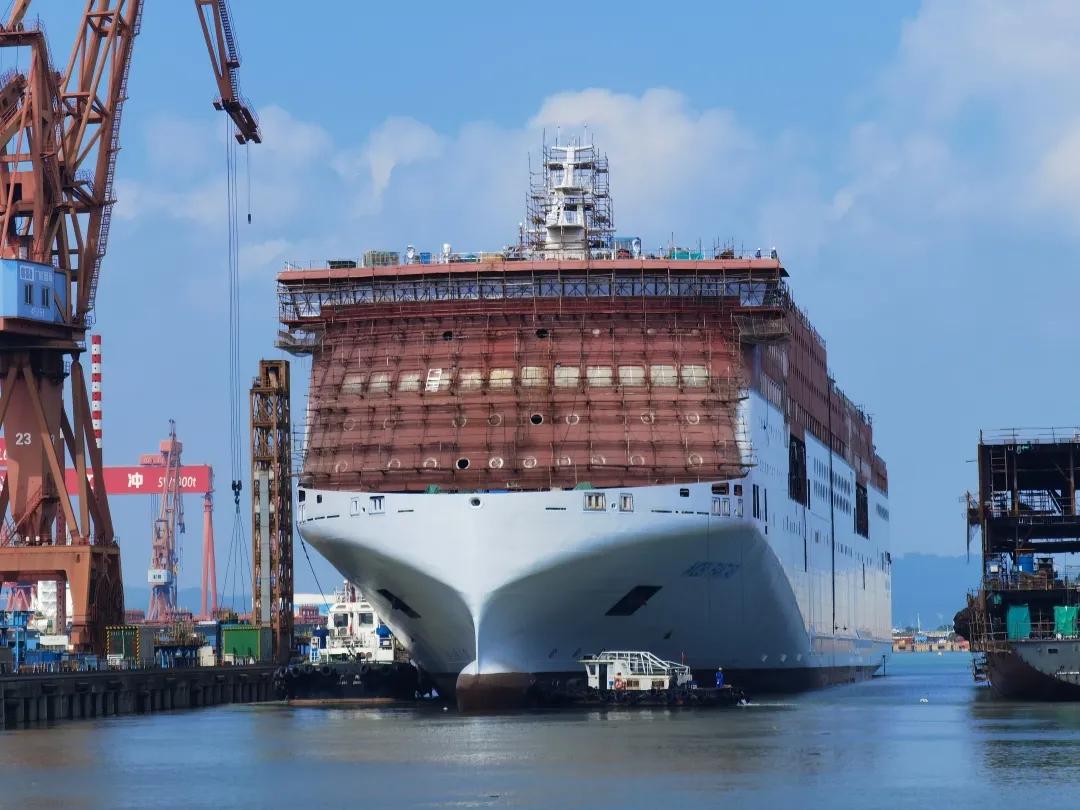 該船實現了出塢前上建亮燈。電纜拉放完成率87.8%,作為全球最大的豪華客滾船,該船全船電纜長度達到了946公里(相當于從廣州到重慶);出塢前已完成了830公里電纜的拉放工作。涂裝完整性實現突破,該船出塢時上層建筑上方仍有部分區域未完成涂裝? 這是因為該船垂直高度已接近40米,超過了船塢高空車的最大極限。