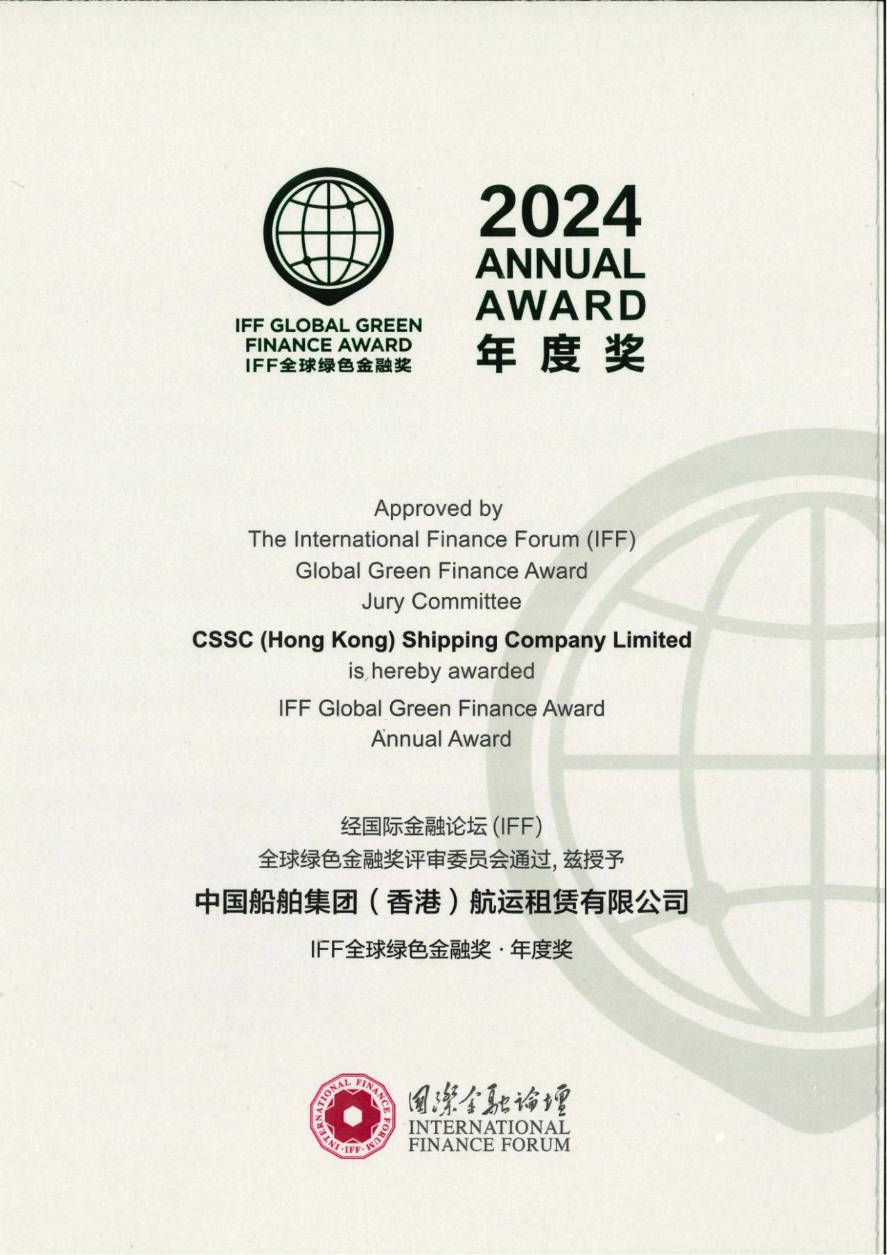 日前,在中國香港舉行的國際金融論壇(IFF)第21屆全球年會(F20峰會)上,發布了第五屆“IFF全球綠色金融獎”評選結果。中國船舶集團中船租賃憑借其在綠色金融領域綜合實踐的杰出表現,首度榮膺“IFF全球綠色金融獎——年度獎”。這是繼2021年獲得“IFF全球綠色金融創新獎”,中船租賃再上一層樓,榮獲年度大獎。