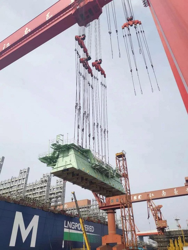 ????他們為法國達飛海運建造的全球最大雙燃料集裝箱船 23000箱系列船的第二艘船主機吊裝完成,創造了國內迄今為止該型號主機吊裝周期最短紀錄。此次吊裝的主機太大,總重量高達2200噸,公司要求7天完成主機吊裝、安裝的目標。按照傳統的工作方式,這幾乎是不可能完成的任務,整個項目的參與人員面臨前所未有的壓力。