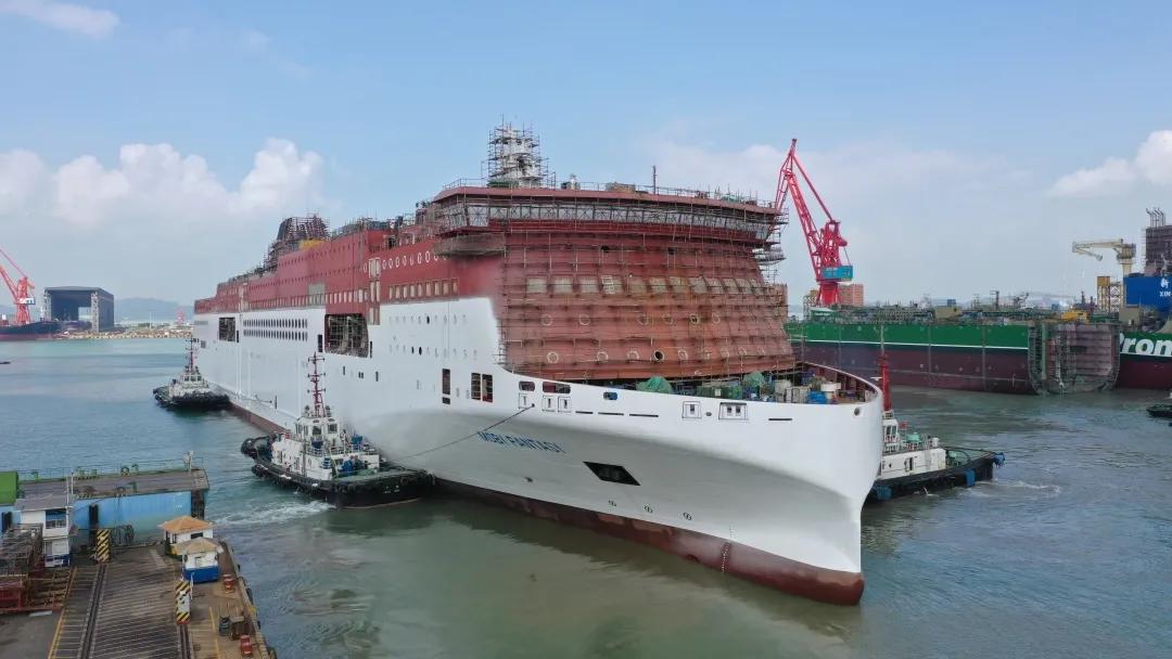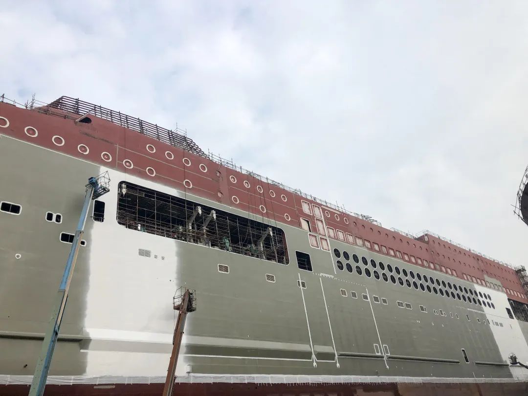 該船實現了出塢前上建亮燈。電纜拉放完成率87.8%,作為全球最大的豪華客滾船,該船全船電纜長度達到了946公里(相當于從廣州到重慶);出塢前已完成了830公里電纜的拉放工作。涂裝完整性實現突破,該船出塢時上層建筑上方仍有部分區域未完成涂裝? 這是因為該船垂直高度已接近40米,超過了船塢高空車的最大極限。