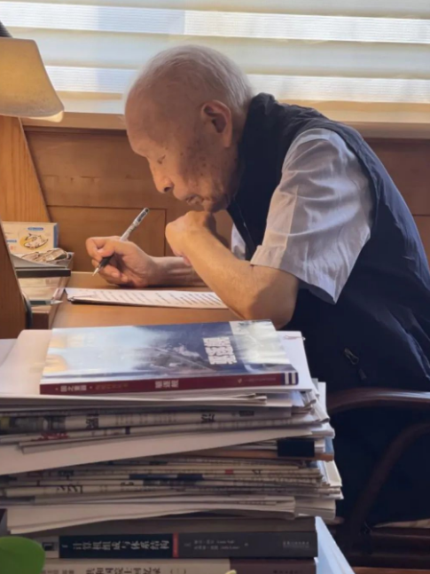 我是記者江曉晨。92歲的潘鏡芙左眼幾乎失去了感光能力,他把工作臺(tái)放在陽臺(tái),這里采光好,方便他讀書寫字。下午的陽光透過玻璃,打在書本上。潘鏡芙向前探著身,平靜而專注,大約他還想離書本更近一些,看得再仔細(xì)一些,這樣才能趕上不斷移行的陽光,趕上嘀嗒疾走的時(shí)間。