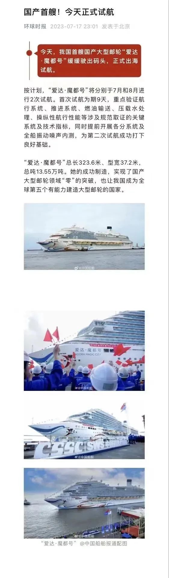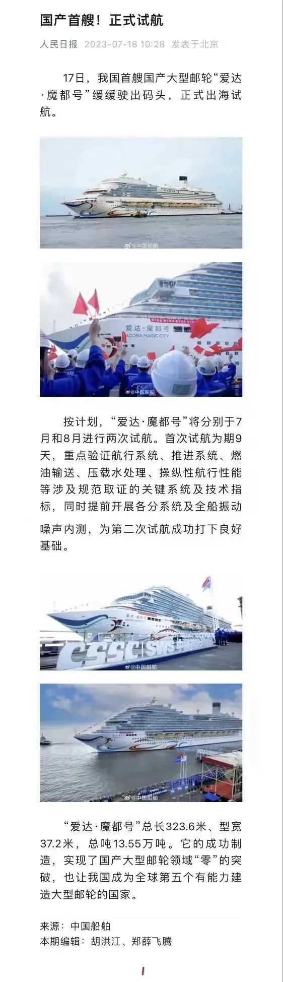 國產首制大型郵輪試航