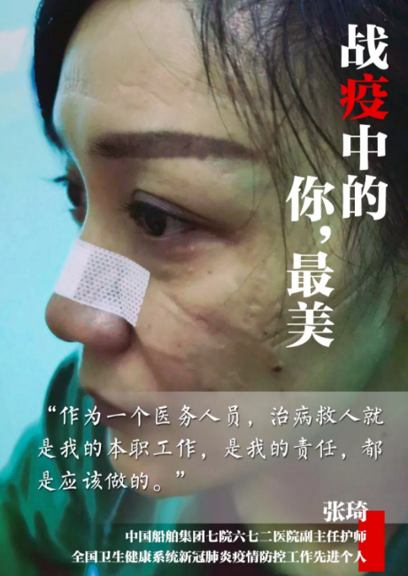 ????張琦,現為六七二醫(yī)院感染三科臨時黨支部黨員,感染三科護士長。她在1月26日,湖北六七二中西醫(yī)結合骨科醫(yī)院被征為“新冠肺炎”定點收治醫(yī)院時,第一時間寫下請戰(zhàn)書上陣一線。雖然骨折尚未痊愈,仍帶領全科護士投入到緊張而又忙碌的病房改造準備工作中,搬運設備、物資,常常加班到深夜,以實際行動展現了醫(yī)者大美和巾幗大愛的高尚品格及別樣風采!